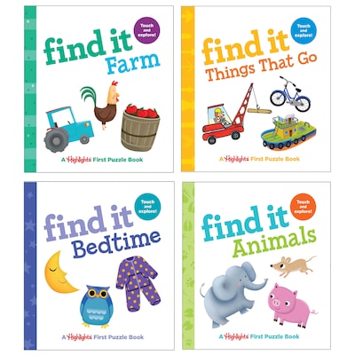 Our Find It Board Books are baby's first puzzles. They include age-appropriate seek-and-find fun for little ones, plus bonus activities that explore shapes, sounds, numbers and colors. All 4 books help spark early learning by combining vibrant, baby-friendly pictures and developmentally appropriate challenges. Plus, parents can bond with their little ones while they point to the objects in each fun book. This book set includes the following 4 titles: Find It Board Book – Animals, Find It Board Book – Bedtime, Find It Board Book – Farm, and Find It Board Book – Things That Go.