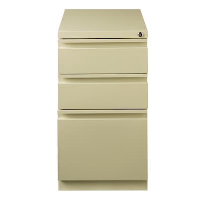 20-inch deep Mobile Pedestal File Cabinet with a three-drawer box-box-file drawer configuration is designed to provide storage solutions for your home or professional office. It features durable, fully assembled steel construction with a non-porous surface that is easy to clean. These commercial grade mobile pedestals come standard with factory installed hidden casters, full extension drawers, counterweights, and a core-removable file cabinet lock for security. The file drawer accommodates letter-size hanging files. The commercial grade ball-bearing drawer slide suspension ensures a smooth and quiet drawer performance. Extended fronts with full-width drawer pulls provide a sleek and contemporary design. These metal file cabinets are available in multiple colors to enrich your workspace. It's 27.75" height allows these units to roll under most work surfaces and office desks. Limited Lifetime Warranty. Unit meets or exceeds ANSI-BIFMA industry standards. Greenguard Gold Certified.