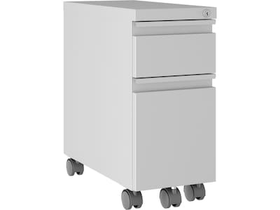 Compact alternative to standard pedestal files. The narrow design works great for smaller desks. Holds essential workstation supplies in the box drawer. File drawer holds letter or legal size hanging file folders. Durable, fully assembled steel construction with non-porous surface is easy to clean. Lightweight design makes it easy to roll around. Includes a 5th swivel caster for stability eliminating the need for counterweights. Greenguard Gold certified for indoor air quality. Limited lifetime warranty.