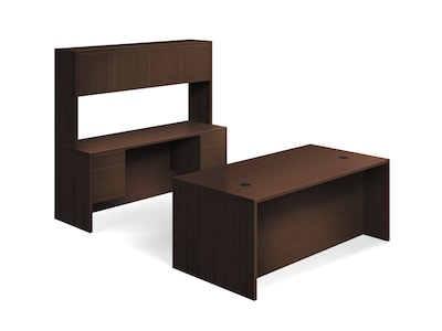 Build a hard-working workstation with 10500 Series laminate from HON, our bestselling desk collection. This 72"W double pedestal desk and 72"W double pedestal credenza with 3/4 pedestals and stack-on storage create a hardworking, efficient executive workstation. Four box drawers provide convenient storage for office supplies, and four file drawers organize paperwork. Four overhead doors conceal personal items and sensitive work-related materials. Laminate finish color is Mocha.