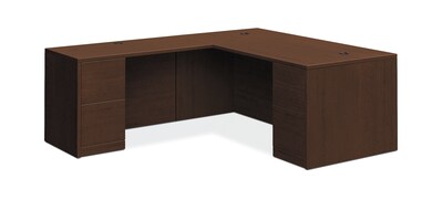 Build a hard-working workstation with 10500 Series laminate from HON, our bestselling desk collection. This righthanded 72"W x 84"D L-workstation with full pedestals create a hardworking, efficient executive workstation. Two box drawers provide convenient storage for office supplies, and three file drawers organize paperwork. Laminate finish color is Mocha.