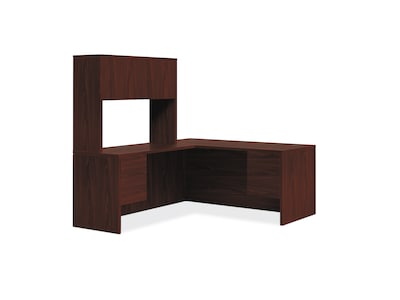 Build a hard-working workstation with 10500 Series laminate from HON, our bestselling desk collection. This righthanded 66"W x 78"D L-workstation with 3/4 pedestals and stack-on storage creates a hardworking, efficient executive workstation. Two box drawers provide convenient storage for office supplies, and two file drawers organize paperwork. Four overhead doors conceal personal items and sensitive work-related materials. Laminate finish color is Mahogany.
