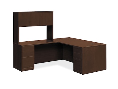 Build a hard-working workstation with 10500 Series laminate from HON, our bestselling desk collection. This righthanded 72"W x 84"D L-workstation with full pedestals and stack-on storage creates a hardworking, efficient executive workstation. Two box drawers provide convenient storage for office supplies, and three file drawers organize paperwork. Four overhead doors conceal personal items and sensitive work-related materials. Laminate finish color is Mocha.