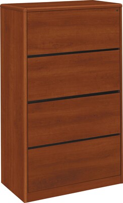 Upscale 10700 Series laminate desking from HON features real wood accents and waterfall-shaped edges. This four-drawer lateral file increases the storage capacity of the workstation and features ball-bearing drawer suspensions. Laminate color is Cognac.