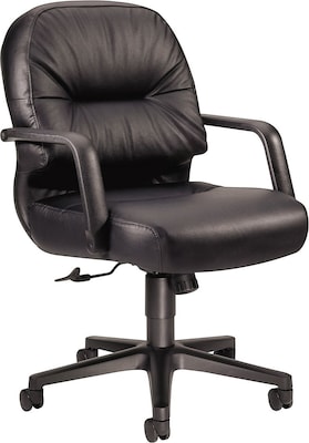 The HON pillow-soft executive chair in black is made of durable leather and is ideal for office desks. This chair measures 41.75 x 26.25 x 28.75 inches and has a back cushion that combines both foam and a layer of polyester fiberfill to support your spine.