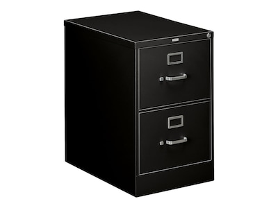 - Two-drawer vertical filing cabinet holds legal-size documents