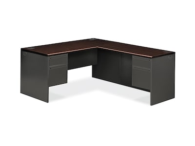 Upgrade your office setup with this HON 38000 Series left L-station, which comes in a warm, welcoming charcoal and mahogany color scheme. The high-pressure laminate top stands up to spills, splashes, and scratches, keeping your work area clean and professional. A waterfall edge offers a gently curved design to keep your wrists comfortable as you type, while the spacious two-part work surface boasts separate areas for your computer setup and paperwork. Featuring two file drawers with ball-bearing glides, this desk keeps client files and forms close at hand. Use the two box drawers to store personal items and office supplies to prevent clutter from overtaking your work area. The HON One Key removable lock system keeps all items inside the drawers secure whenever you're away from your office. Three cable management ports prevent jumbles of cords and wires for a neat, tidy appearance. Featuring built-in modesty panels, this HON 38000 Series left L-station provides added privacy and keeps bags and briefcases shielded from view.
