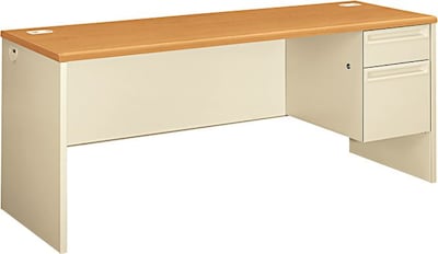 HON® 38000 Right single pedestal credenza in harvest/putty color measuring 29 1/2" x 72" x 24" has harvest laminate on steel over honeycomb composite top for strength.