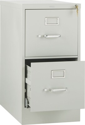 HON 510 Series 2-Drawer vertical file cabinet in light gray finish measures 29.0" x 15.0" x 25.0" and has double-walled front kickplate to resist impact. Letter size cabinet with 4 vertical reinforcements is ideal for high-security document storage.