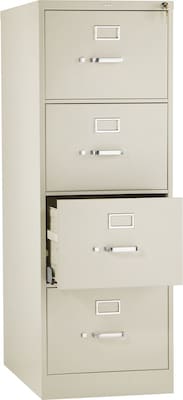 HON® 510 Series vertical file cabinet in putty color measuring 52" x 18 1/4" x 25" features four drawers to offer extra storage space for file folders. Cabinet includes an adjustable wire follower in each drawer to keep legal size files upright.
