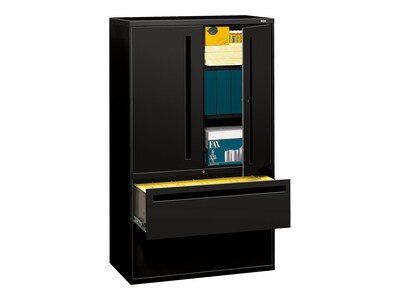 Organize paperwork and supplies with this HON Brigade 700 Series lateral file cabinet. Two spacious drawers accept both legal and letter folders for flexible filing options. The three-shelf cabinet provides ample space for binders, reams of paper and small office essentials, keeping all of your most important items stored in one central location. With an all-welded case construction, this HON Brigade 700 Series lateral file cabinet stands up to heavy use.