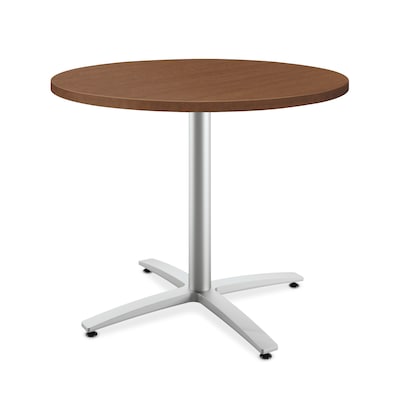 HON Between Round Table, Seated Height X-Base, 36"D, Shaker Cherry Laminate/Textured Silver Finish