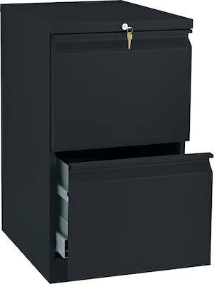 With its sleek black finish, the HON Brigade two-drawer radius-pull mobile pedestal file allows you to create extra storage space without compromising the style of your office. The file comes with two spacious high-side drawers on smooth ball-bearing suspensions, each designed to hold letter-size files. Four swivel casters enable easy movement, and the HON interchangeable-core lock ensures maximum security.