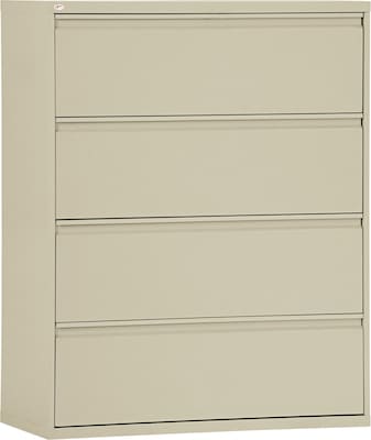 - Three-drawer lateral filing cabinet holds letter- or legal-size documents
