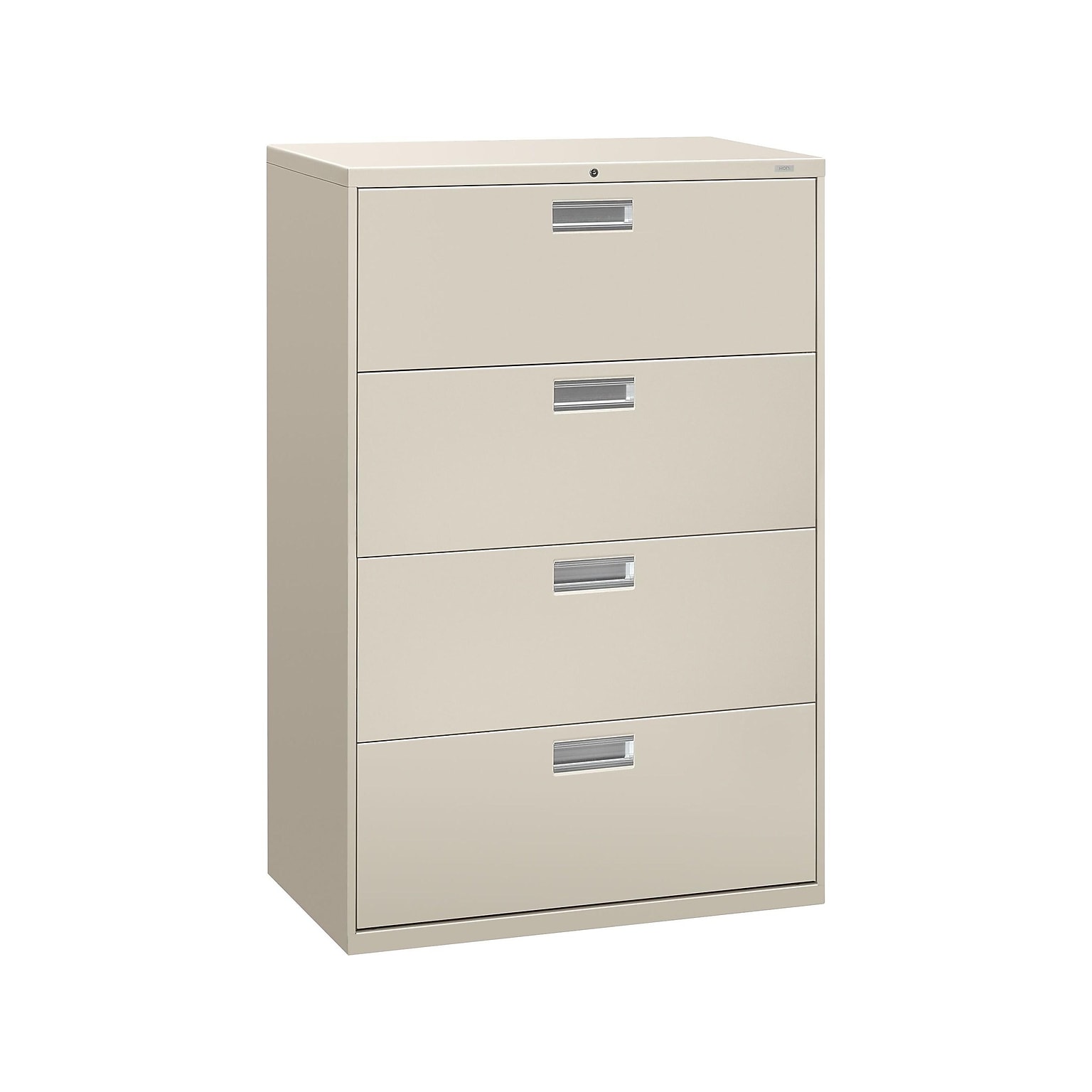 - Four-drawer lateral filing cabinet holds letter- or legal-size documents