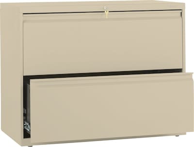 HON® Brigade™ 800 Series Lateral file cabinet in putty color offers multiple and efficient storage for letter/legal size filing. Lateral file cabinet measuring 36''W x 18''D x 28''H has 2 drawers with steel bearing suspension for smooth operation.