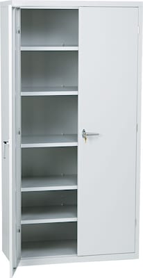 HON® Brigade® 6-Shelf assembled storage cabinet in light gray color measuring 72" x 36" x 18" features three-point locking system for added safety. Cabinet has satin chrome double handles that helps to secure multiple doors/drawers.