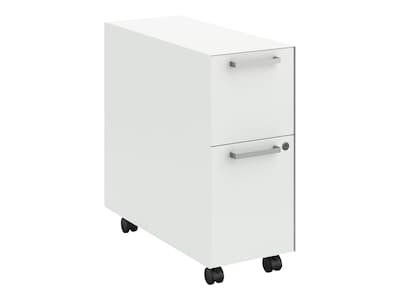 - This slim mobile pedestal allows for more space underneath the work surface; includes a 9"H bin with an accessory tray and a 12"H file to help you wrangle everything from work supplies to snacks to sneakers