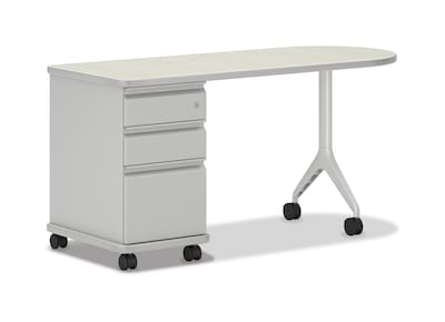 The ultimate teacher's assistant is the HON SmartLink mobile teacher station that accommodates technology and includes storage to keep school supplies well-organized and lessons visual and dynamic. This value teacher's station pedestal desk can be effortlessly wheeled anywhere in the learning environment, while offering the work surface and storage teachers need to stay on top of their lesson plans. The two box drawers provide tons of space for classroom supplies, while the file drawer accepts hanging files in either letter or legal format. The laminate finish is silver mesh; the edge band color is platinum; the modesty panel is platinum metallic.