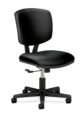 Bring a modern look to your office or cubicle with this HON Volt task chair. Rich leather upholstery brings a luxurious, contemporary feel to your office, while the simple silhouette coordinates effortlessly with a range of decor themes. An armless design makes it easy to get in and out of this chair, so you can quickly transition to new tasks. Featuring contoured seat and back cushions, this office chair delivers a comfortable seating experience for users big and small. The center tilt function lets you recline back in the seat, while upright tilt lock promotes better posture when you're working on the computer. This HON Volt task chair comes equipped with pneumatic seat height adjustment for a more customized setup.