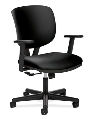 Enjoy all-day ergonomic comfort with this black task chair from HON. Its adjustable features let users personalize the chair's fit to ensure proper posture and minimize stress and strain on the back and legs. The HON Volt Leather task chair has a center tilt feature for a relaxed recline, and a tilt lock keeps the chair upright when working at a desk. Five dual-wheel casters and 360-degree swivel give this task chair exceptional mobility within the workspace.