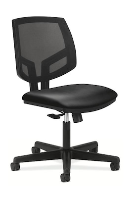 Give your staff all-day comfort with this HON Volt mesh-back task chair. The black SofThread leather seat features a plush padded cushion, while the mesh back lets air circulate to keep you cooler throughout the day. With pneumatic seat height adjustment, this office chair offers customization options for every user. The center tilt function creates the perfect ratio of recline, so you can sit back comfortably. Use the tilt lock function to secure the seat at the right angle for work or rest and rotate from one task to another with the 360-degree swivel function. This HON Volt mesh-back task chair comes in an armless design, making it easy to get in and out of the seat.