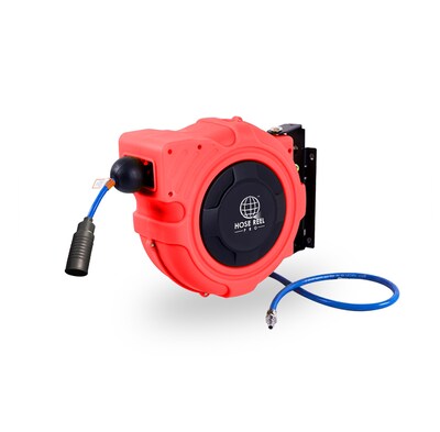 Upgrade your workspace with Hose Reel Pro's 50 ft Air Hose Reel featuring a self-retracting mechanism that effortlessly extends and neatly coils your air hose to prevent tangles and minimize wear. This compact unit features a 180 degree swivel mount and it can handle pressures up to 300 psi, making it durable enough for the most demanding tasks. Whether you're powering pneumatic tools, performing detailed woodworking, or handling heavy-duty cleaning jobs, this hose delivers consistent, reliable performance.