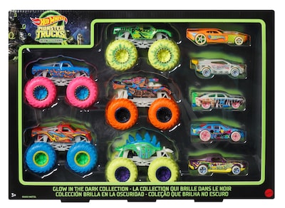 - "Hot Wheels® Monster Trucks literally turn out the lights with 10 Glow in the Dark 1:64 scale die-cast vehicles!