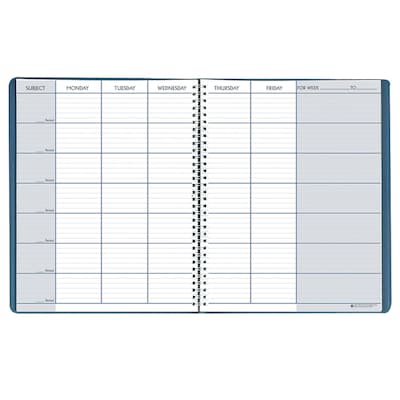 Includes seating chart, term program, test and attendance records. One week per two-page spread. 40 weeks / 7 periods. Days of the week are across the top and periods down the right hand side. Blue embossed simulated leather cover, non-refillable. Measures: 8 1/2" x 11". Printed on 100% post-consumer recycled paper with soy ink. Made in USA. Sold as a pack of 2 planners.