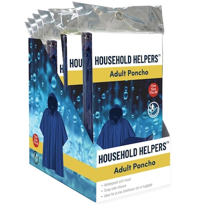 Household Helpers Adult Rain Poncho with Hood, One Size Fits All, Blue, 6/Pack, 12 Packs/Carton (16630)