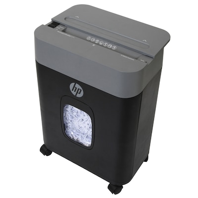 The HP-CC12 Crosscut Shredder from HP protects all sensitive documents to avoid identity theft. The HP-CC12 shreds up to 12 sheets at a pass as well as small staples and credit cards. It also features an easy, pull-out bin with viewing window so you can see when to empty. Casters let you move the HP-CC12 from room to room with ease. A unique Slide-Top housing hides the paper entry slot and electronics for a smooth sleek functional surface. The large 3.4-gal. pullout waste bin holds hundreds of shredded pages. It comes with a full 1-year warranty.