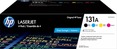 - What's in the box: 4 new Original HP 131A Black/Cyan/Magenta/Yellow Standard Yield Toner Cartridges (CF210AQ1)