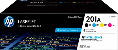 - What's in the box: 4 new Original HP 201A Black/Cyan/Magenta/Yellow Standard Yield Toner Cartridges (CF400AQ1)