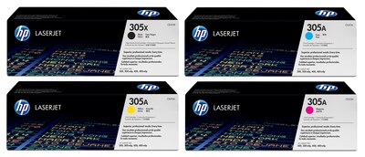HP 305 Black High Yield and Cyan/Magenta/Yellow Standard Yield Toner Cartridge Set, 4/Pack