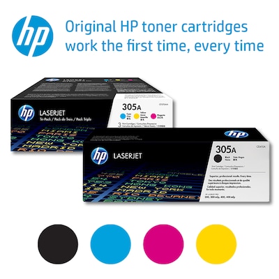 HP 305A toner cartridge features the latest laser print technology and provides fast, reliable, high-quality prints. HP 305A black toner cartridge yields up to 2,000 pages while the HP 305A cyan, magenta, and yellow cartridges yield up to 2,600 pages.