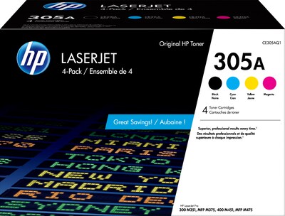 - What's in the box: 4 new Original HP 305A Black/Cyan/Magenta/Yellow Standard Yield Toner Cartridges (CE305AQ1)