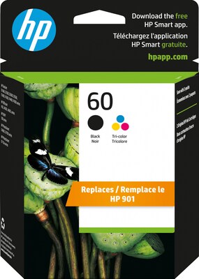 - What's in the box: 2 new Original HP 60 Black/Tri-Color Standard Yield Ink Cartridges (N9H63FN)