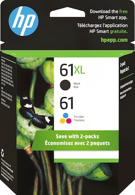 Save money on every page with an Original HP 61 and 61XL black and tri-color 2-pack. Get the quality of Original HP 61 ink on every page with vibrant colors and striking detail. With 2-packs, you can grab everything you need in one trip so you can save time: tri-color ink makes your images pop while rich blacks add color and shade variety to your prints.