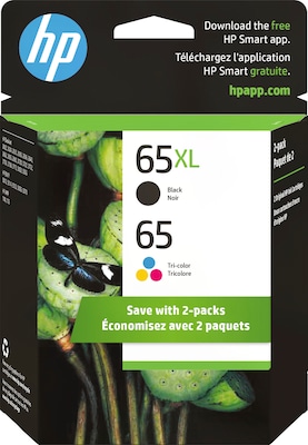 - What's in the box: 2 new Original HP 65XL/65 Black High Yield and Tri-Color Standard Yield Ink Cartridges (6ZD95AN)