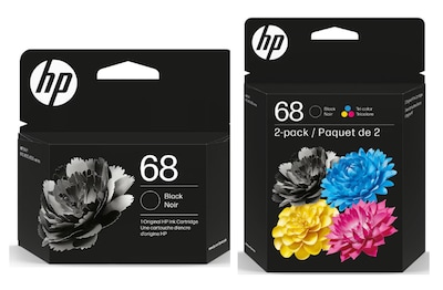 - What's in the box: 3 new Original HP 68 Ink Cartridges — 2 black, 1 tri-color (6L6S2TN). This convenient bundle ships in multiple packages