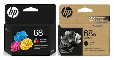 - What's in the box: 1 new Original HP 68e Black EvoMore Ink Cartridge (7FP22TN), and 1 new Original HP 68 Tri-color Ink Cartridge (7FP20T)