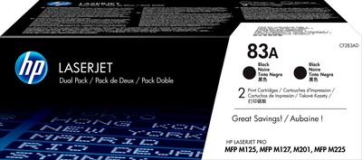 - What's in the box: 2 new Original HP 83A Black Standard Yield Toner Cartridges (CF283AD)