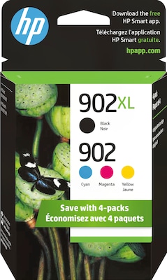 Get the HP quality you trust and keep printing with Original HP 902XL black and HP 902 cyan, magenta, and yellow ink cartridges. Ensure vivid presentations and home projects every time you print. This HP 902XL/902 ink cartridge 4-pack provides all the ink you need to print, so you can create stunning prints at home. Trust HP printer ink for home or home office printing and get back to the things that matter.