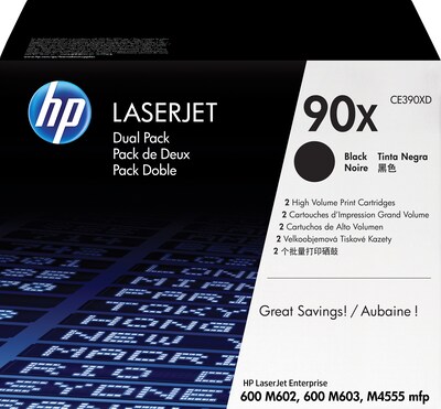 - What's in the box: 2 new Original HP 90X Black High Yield Toner Cartridges (CE390XD)