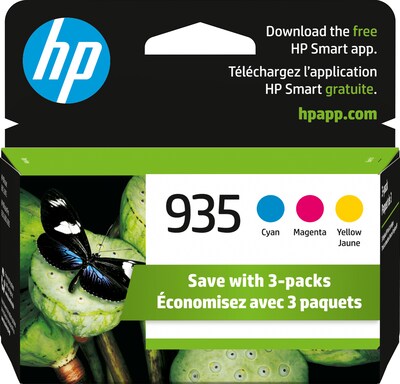 HP 935 C/M/Y Color Ink Cartridges (N9H65FN#140) Value Combo 3/Pack provides outstanding print quality for your important documents and presentations. HP inks are formulated to consistently produce vibrant color documents at a great value. Count on outstanding prints from cartridges specially designed to work with your HP printer. Designed to consistently deliver standout color, HP inks provide durable prints that resist water and last for decades.