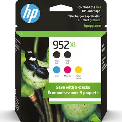 Save money on every page with an Original HP 952XL ink cartridge 5-pack. Get the quality of the Original HP 952 ink on every page with vibrant colors and striking detail. With 4-packs, you can grab everything you need in one trip so you can save time: cyan, magenta, and yellow ink makes your images pop while rich blacks add color and shade variety to your prints.
