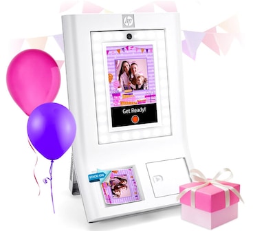 Take your next event to the next level with the HP Sprocket Photobooth! This one-of-a-kind photobooth device lets you instantly take and share fun, customized photos on 3x4” sticky-backed photo paper. Simply choose from the available categories to find the perfect layout for your event, select and customize your frames and filters and get the photobooth magic started!