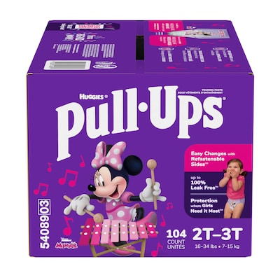 Make potty training fun, fast and easy with Pull-Ups Training Pants! Made with soft and breathable materials, these training pants are extra comfy for your child throughout the day. Pull-Ups training pants are flexible, with an underwear-like fit for easy training and outstanding protection. Not only do they provide all-around coverage, but they also feature stretchy sides that your child can easily move up and down to help them feel like a Big Kid. The refastenable sides make it easy for fast changes, allowing you to keep pants and shoes on your toddler. Plus, the adjustable sides let you customize your child's waistband and easily check for messes! Each pack includes two exclusive music designs featuring Disney's Minnie Mouse, with instrument graphics that fade when wet to help motivate your child to stay dry. Tell the story of how Minnie Mouse loves making music and your child can help keep the music going! Making music with Minnie Mouse comes to life with interactive digital tools and fun extras like an inside-the-box coloring mat. When your child is ready to begin her potty training journey, the Pull-Ups brand can help. Visit the Pull-Ups website for expert potty training tips and resources. We've helped train 60 million Big Kids and counting!* (*US and CA)