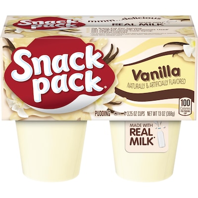 Share the desserts you loved while growing up with your own kids today with Snack Pack Vanilla Pudding Cups. Snack Pack's Vanilla pudding dessert is the sweet and creamy classic everyone loves. Vanilla Snack Pack Pudding Cups are gluten-free and Kosher, and are made with real milk for a smooth, creamy treat. Perfect for a sack lunch or on-the-go, these pudding cups are a creamy, delicious snack the whole family is sure to love. Snack Pack Vanilla Pudding has 100 calories with no preservatives and zero grams trans fat per 3.25 oz serving.