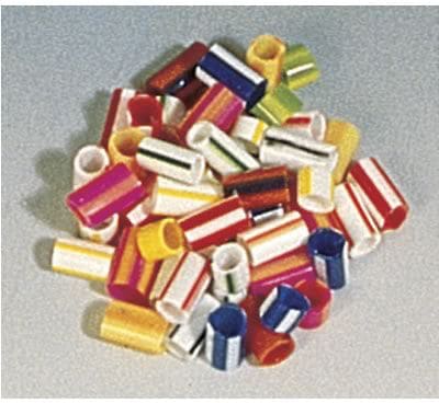 Hygloss® Striped straw bucket O" beads in assorted colors are ideal for grades pre-school - 12 and made of durable plastic. Colorful beads in assorted sizes have popular shapes to complement teaching of bead craft and are sold as 100 per pack.
